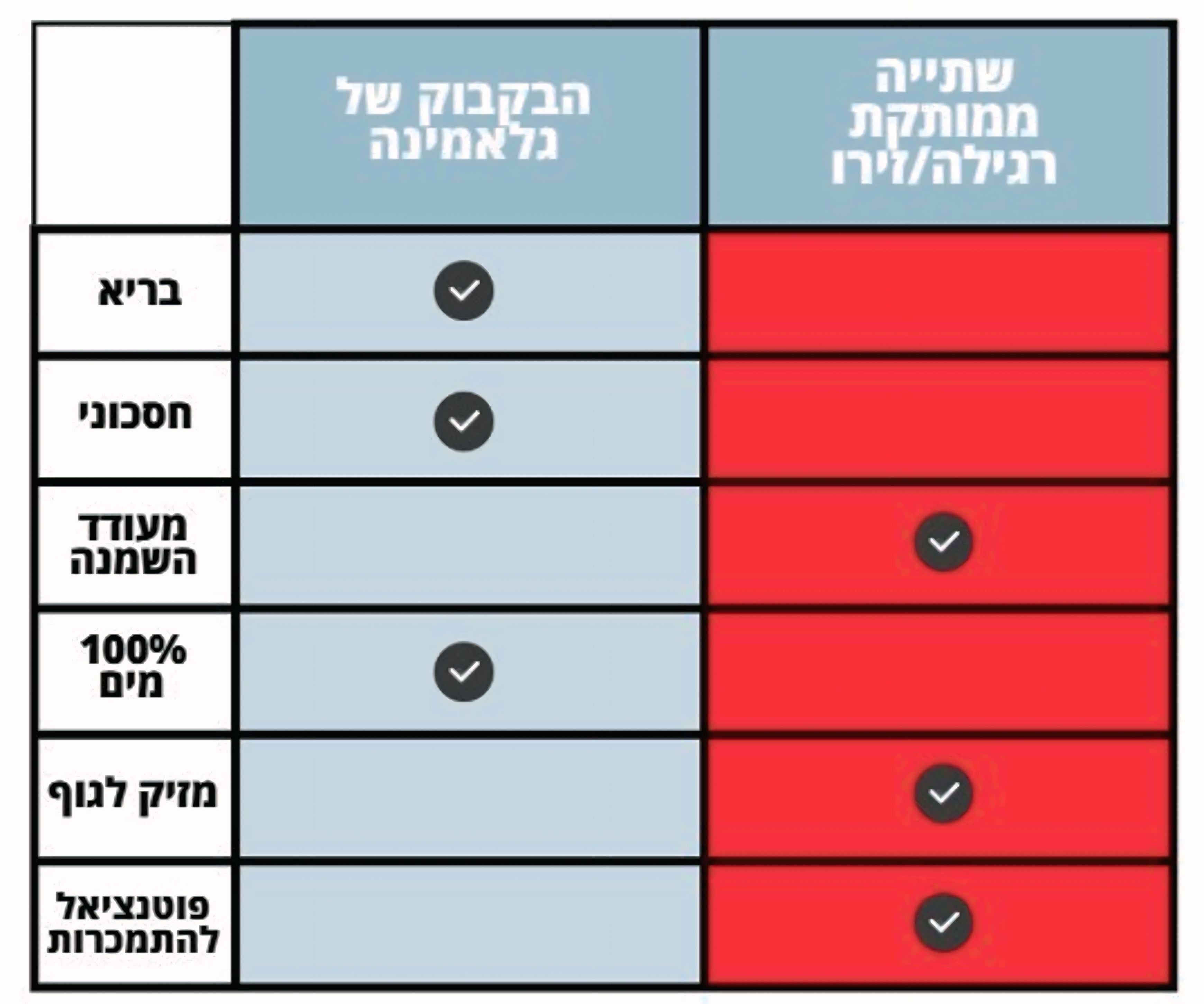 כמה שקלים פה ושם, אך למעשה במצטבר מדובר במאות שקלים בחודש, שלא לדבר על המחיר הבריאותי. הבקבוק של גלאמינה הוא השקעה חד פעמית שמחזירה את עצמה במהירות! פתרון חכם, טעים ובריא לשדרוג איכות החיים במחיר מנצח.